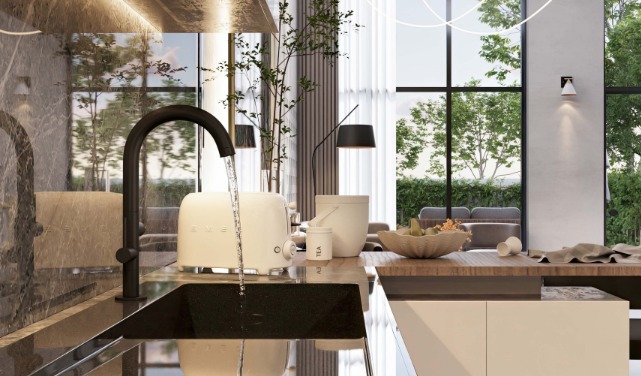 Double-height living rooms in some units